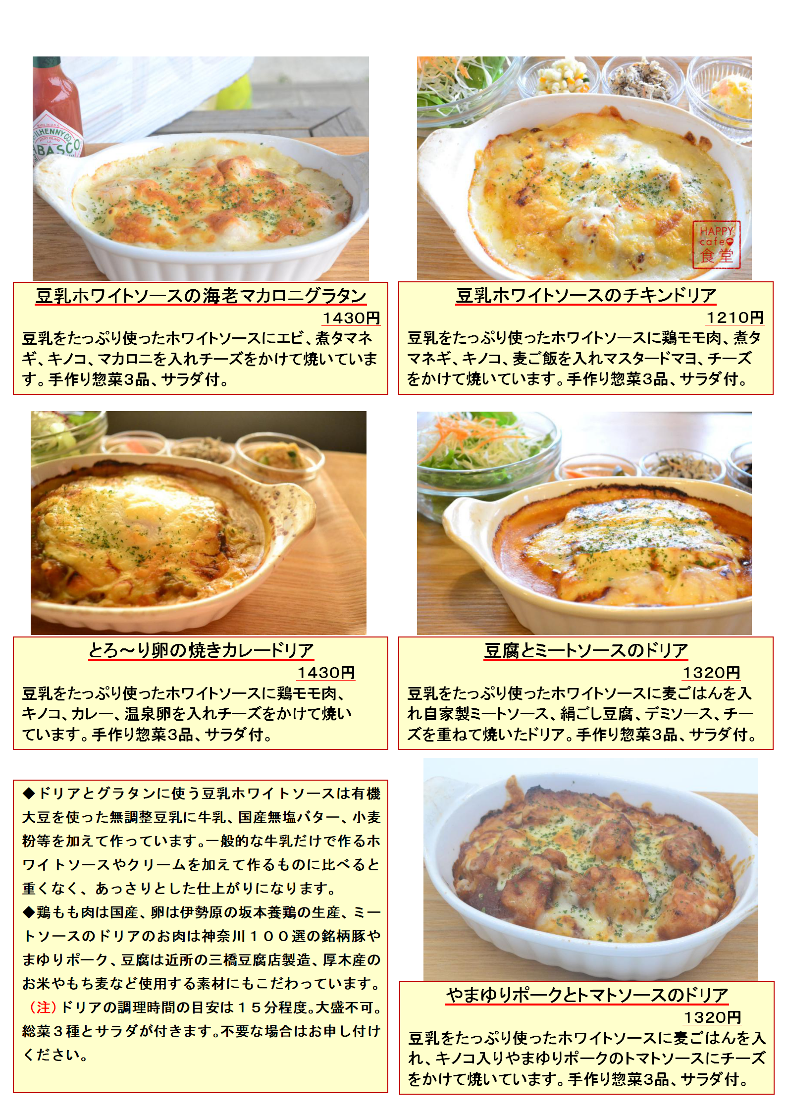 夫婦で営む小さなカフェは総席数17席の和な作りで、カウンター席とコルクマットが敷かれたお座敷があります。座敷にはペレットストーブがあり冬場は温かみをより一層引き立てます。HAPPY cafe 食堂はカレーとドリアを主に手作り料理に拘ってお店を営んでおります。ただの手作り料理では無くとことん拘っています。それはお客様が安心して飲食が出来る素朴でヘルシーな料理です。ここでしか食べる事が出来ないものを一つでも多くそろえ、少しでも皆様に興味を持っていただく事はいつか足を運んでいただける切っ掛けになると思っています。ご来店下さったお客様にもご満足頂きいつの日か「もう一度あそこに行ってみよう」と思って頂ける様に、その日が来る事を心から願い日々の仕事に励んでおります。